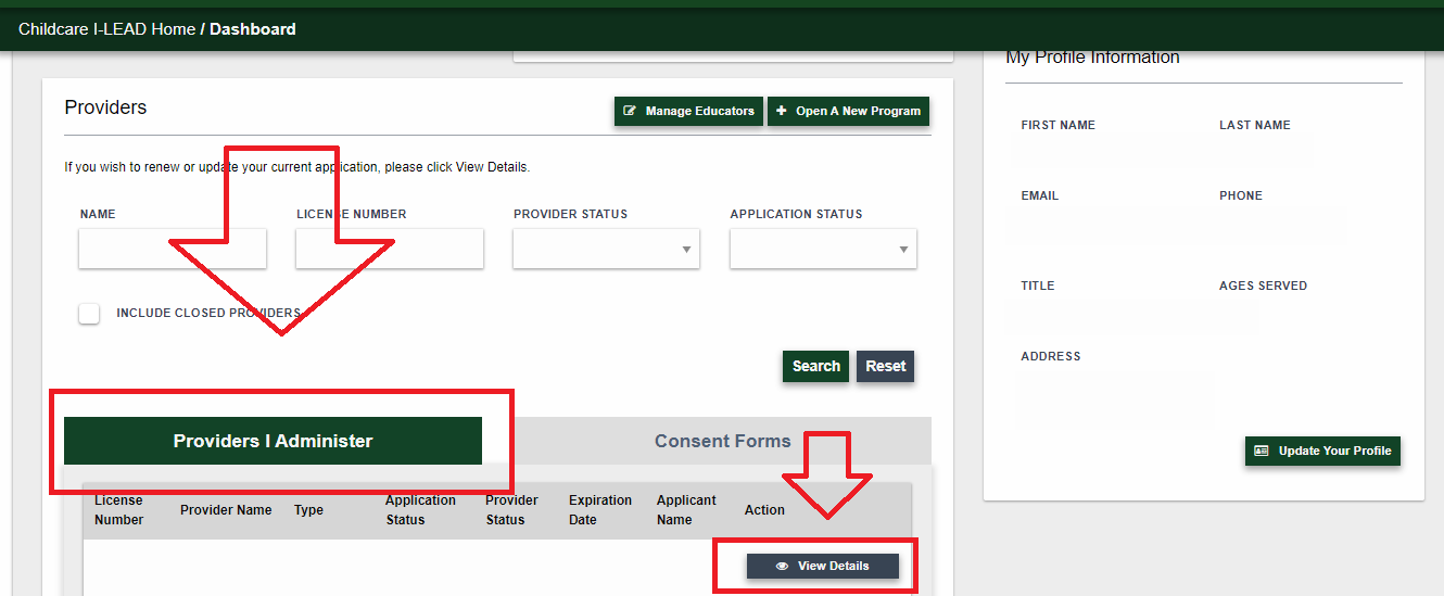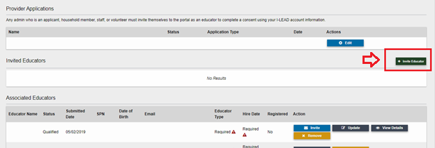 Educator Invitations: An educator invitation connects a new hire’s I-LEAD account to a specific license so they receive a consent form for that location. Consent forms are due anytime fingerprints are due, which is usually when someone is invited to a new site or every three years. Educators must receive and accept an educator invitation from each facility where they work to connect their account to the locations and receive the consent form. If an educator plans to work at multiple locations, it is best to accept invitations for all facilities first and complete one consent form. If an educator accepts an invitation and completes a consent form for one location before accepting invitations for other locations, they must do separate consent forms for each. Only one applicant is permitted on the Associated Educator roster; before inviting someone with this role, all previous educator types on the roster should be set to a different educator type. Trying to send an educator invitation to someone who is already on the roster as “Applicant” could prevent the educator invitation or the renewal application from submitting.