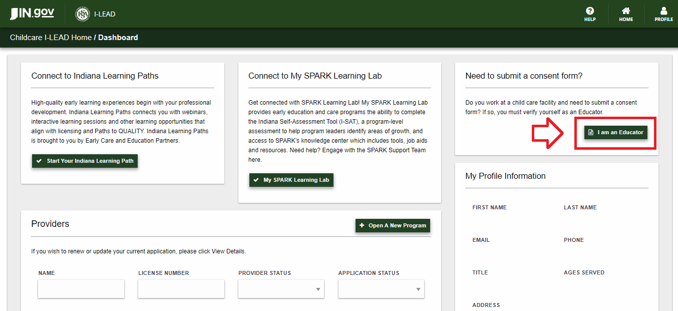 3.) I am an Educator button: Educators can create new I-LEAD accounts to merge with records from previous I-LEAD accounts or connect with past consent records submitted by the consultant/previous child care facility for existing I-LEAD accounts. An educator who merges their records will not need an educator invitation if the license shows in the Providers section once records are merged. To see if your educator(s) should merge instead of receiving an invitation, check your Associated Educator roster via the View Details button of that license. If they are listed but have a "No" or "Invited" status under Registered, direct them to merge when they log into I-LEAD. Those who see this page and have an invitation from no_reply_i-lead@www.in.gov need to retry logging in from their invitation, as the invitation process was disrupted. The invitation must be accepted within 72 hours and completed from start to finish on a single device.
