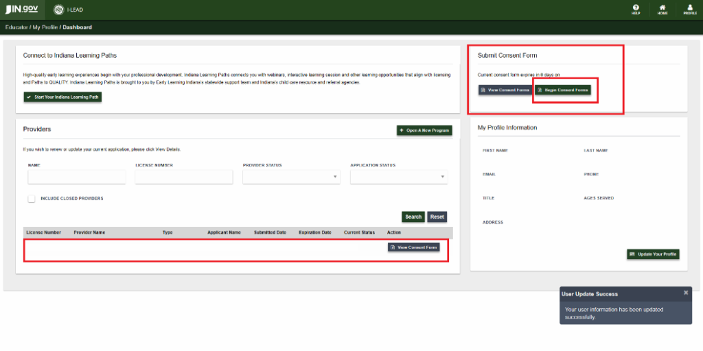 Educator Invitations & Consent Forms Post-Submission: Staff who were only on the Associated Educator Roster section of the application will receive a new consent form to complete for the new license number. Everyone new who was listed on the Invited Educators section of Educators in the application will receive an email from no_reply_i-lead@fssa.in.gov after the application has been signed and submitted. Make sure each person has created an I-LEAD account before they accept the educator invitations sent to their email inboxes. If the educator invitations are successfully accepted, each person will have the license number listed in the Provider section of their I-LEAD dashboard and have a consent form to complete and submit with their fingerprints. New and old staff need to complete these for the new licensing application to be processed. Those educators missing an educator invitation should be invited by the person filling out the application. Once all changes and consent forms for a background check have been completed, the licensing consultant will reach out. New provider admins need to accept both an admin invitation to access the license and an educator invitation to access the consent form for a background check.